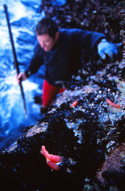 Donde el mar golpea allí está el percebeiro, aprovechando cuando el mar retrocede para el impulso del siguiente golpe el percebeiro, con respeto, recoge los percebes que alimentaran su economía, jugándose la vida en cada embestida.